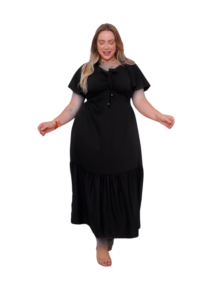 Confeccionado em tecido viscosarja de gramatura 180, ele possui excelente caimento, toque macio e estrutura que valoriza as curvas.