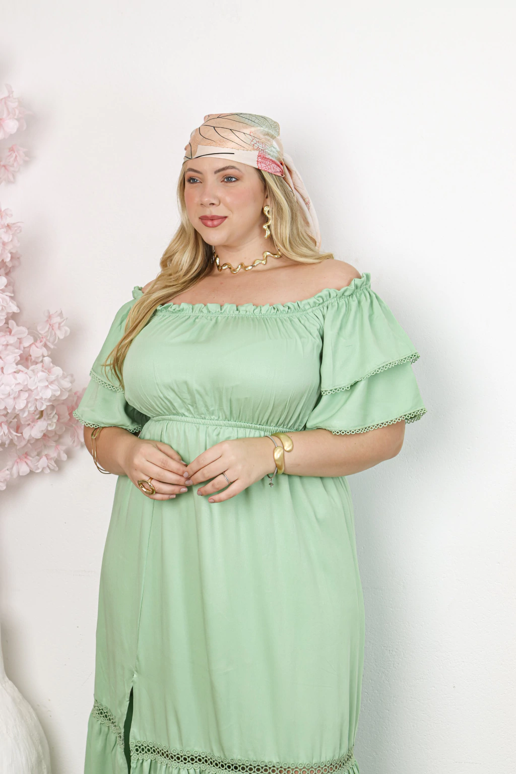 Com decote ombro a ombro e mangas com babados delicados, o modelo transmite feminilidade e movimento em cada detalhe.